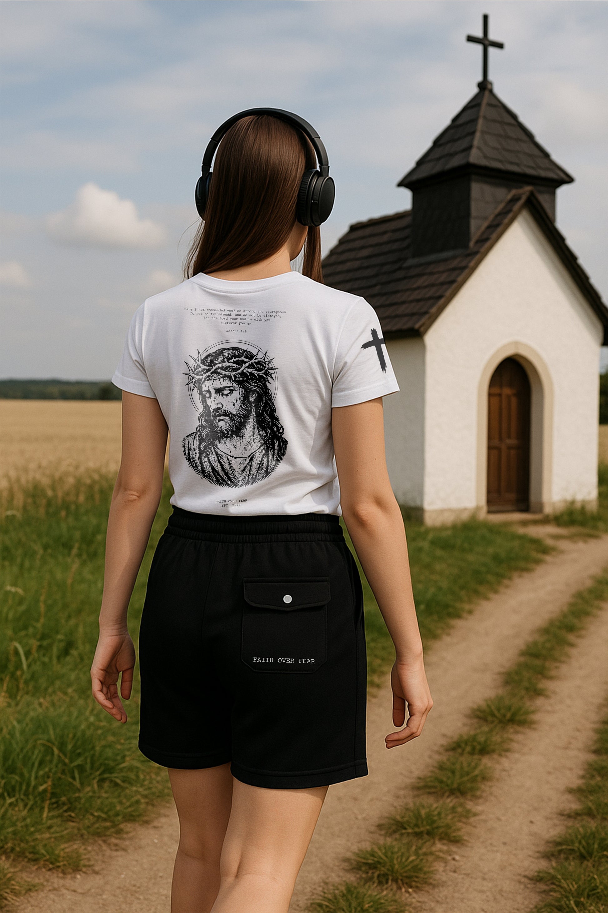 Step into all-day comfort with our Faith Over Fear Fleece Shorts. Designed for both style and freedom, these lightweight, breathable shorts feature our bold message on the back to remind you to live with courage. Made from soft fleece and crafted for movement, they’re perfect for workouts, lounging, or everyday wear. Faith doesn’t just walk—it moves.